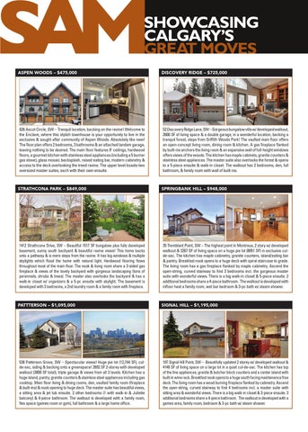 35 Tremblant Point, SW – The highest point in Montreux, 2 story w/ developed walkout & 3267 SF of living space on a huge pie lot (8051 SF) in exclusive culde-sac. The kitchen has maple cabinetry, granite counters, island/eating bar & pantry. Breakfast nook opens to a huge deck with spiral staircase to grade. The living room has a gas fireplace flanked by maple cabinetry. Ascend the open-string, curved stairway to find 3 bedrooms incl. the gorgeous master suite with wonderful views. There is a big walk-in closet & 5-piece ensuite. 2 additional bedrooms share a 4-piece bathroom. The walkout is developed with infloor heat a family room, wet bar bedroom & 3-pc bath w/ steam shower.