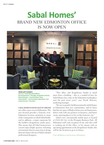 new office space in west Edmonton. The new location provides a fantastic westEdmonton location, proximity to many of the communities in which Sabal builds, and in addition, a major expansion for the builder’s designSense studio space. This means that all Sabal homeowners can now enjoy a bright, spacious, welcoming environment when it comes time to design their new home with one of Sabal’s talented professional designers. 60 New home Guide | nov 22 - dec 20, 2013