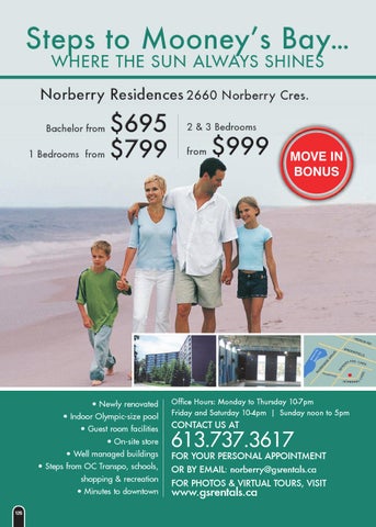 • Newly renovated • Indoor Olympic-size pool • Guest room facilities • On-site store • Well managed buildings • Steps from OC Transpo, schools, shopping & recreation • Minutes to downtown 12G