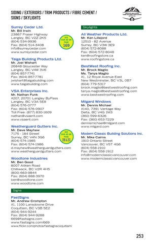 Mr. Dave Mayhew SEE 7175 - 184 Street OUR AD ON PAGE Surrey, BC V4N 3G6 198 & 251 (604) 574-1985 Fax: (604) 574-1986 d.mayhew@weatherguardgutters.com www.weatherguardgutters.com
