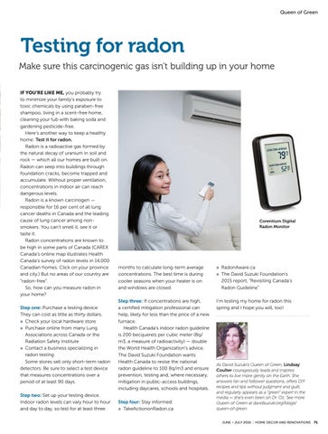 Testing for radon Make sure this carcinogenic gas isn’t building up in your home IF YOU’RE LIKE ME, you probably try to minimize your family’s exposure to toxic chemicals by using paraben-free shampoo, living in a scent-free home, cleaning your tub with baking soda and gardening pesticide-free. Here’s another way to keep a healthy home: Test it for radon. Radon is a radioactive gas formed by the natural decay of uranium in soil and rock — which all our homes are built on. Radon can seep into buildings through foundation cracks, become trapped and accumulate. Without proper ventilation, concentrations in indoor air can reach dangerous levels. Radon is a known carcinogen — responsible for 16 per cent of all lung cancer deaths in Canada and the leading cause of lung cancer among nonsmokers. You can’t smell it, see it or taste it. Radon concentrations are known to be high in some parts of Canada (CAREX Canada’s online map illustrates Health Canada’s survey of radon levels in 14,000 Canadian homes. Click on your province and city.) But no areas of our country are “radon-free”. So, how can you measure radon in your home? Step one: Purchase a testing device. They can cost as little as thirty dollars. » Check your local hardware store » Purchase online from many Lung Associations across Canada or the Radiation Safety Institute » Contact a business specializing in radon testing Some stores sell only short-term radon detectors. Be sure to select a test device that measures concentrations over a period of at least 90 days. Step two: Set up your testing device. Indoor radon levels can vary hour to hour and day to day, so test for at least three