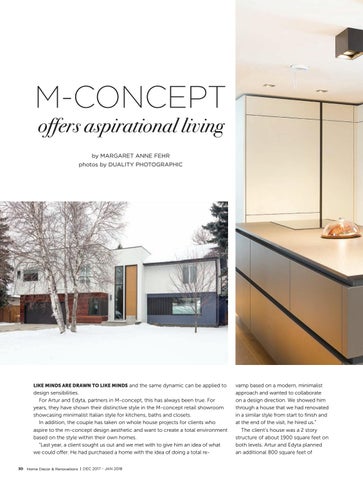 design sensibilities. For Artur and Edyta, partners in M-concept, this has always been true. For years, they have shown their distinctive style in the M-concept retail showroom showcasing minimalist Italian style for kitchens, baths and closets. In addition, the couple has taken on whole house projects for clients who aspire to the m-concept design aesthetic and want to create a total environment based on the style within their own homes. “Last year, a client sought us out and we met with to give him an idea of what we could offer. He had purchased a home with the idea of doing a total re30 Home Decor & Renovations | DEC 2017 - JAN 2018