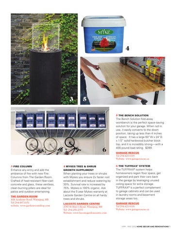 5 THE BENCH SOLUTION The Bench Solution fold-away workbench is the perfect space-saving solution for your garage. When not in use, it easily converts to the down position, taking up less than 4 inches of space. It has a large 60”W x 24”D x 1.5” solid hardwood butcher block top, and it is incredibly strong—with a 400 pound load rating. $399. GARAGE RESCUE Tel 204.421.6118 Website www.garagerescue.ca