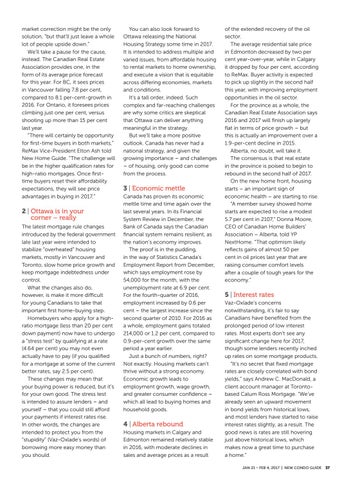5 | Interest rates Vaz-Oxlade’s concerns notwithstanding, it’s fair to say Canadians have benefited from the prolonged period of low interest rates. Most experts don’t see any significant change here for 2017, though some lenders recently inched up rates on some mortgage products. “It’s no secret that fixed mortgage rates are closely correlated with bond yields,” says Andrew C. MacDonald, a client account manager at Torontobased Calum Ross Mortgage. “We’ve already seen an upward movement in bond yields from historical lows, and most lenders have started to raise interest rates slightly, as a result. The good news is rates are still hovering just above historical lows, which makes now a great time to purchase a home.” JAN 21 - FEB 4, 2017 | NEW CONDO GUIDE 37