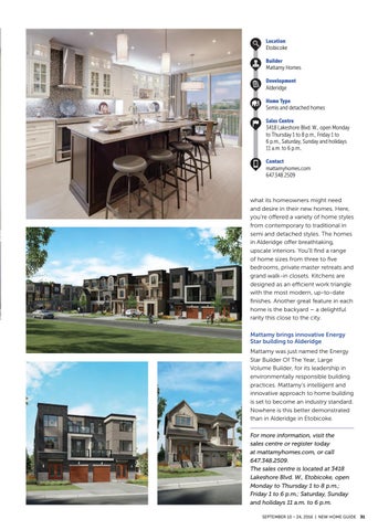 what its homeowners might need and desire in their new homes. Here, you’re offered a variety of home styles from contemporary to traditional in semi and detached styles. The homes in Alderidge offer breathtaking, upscale interiors. You’ll find a range of home sizes from three to five bedrooms, private master retreats and grand walk-in closets. Kitchens are designed as an efficient work triangle with the most modern, up-to-date finishes. Another great feature in each home is the backyard – a delightful rarity this close to the city. Mattamy brings innovative Energy Star building to Alderidge Mattamy was just named the Energy Star Builder Of The Year, Large Volume Builder, for its leadership in environmentally responsible building practices. Mattamy’s intelligent and innovative approach to home building is set to become an industry standard. Nowhere is this better demonstrated than in Alderidge in Etobicoke. For more information, visit the sales centre or register today at mattamyhomes.com, or call 647.348.2509. The sales centre is located at 3418 Lakeshore Blvd. W., Etobicoke, open Monday to Thursday 1 to 8 p.m.; Friday 1 to 6 p.m.; Saturday, Sunday and holidays 11 a.m. to 6 p.m. SEPTEMBER 10 - 24, 2016 | NEW HOME GUIDE 31
