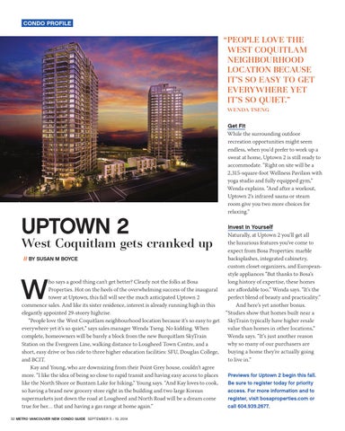 Get Fit While the surrounding outdoor recreation opportunities might seem endless, when you’d prefer to work up a sweat at home, Uptown 2 is still ready to accommodate. “Right on site will be a 2,315-square-foot Wellness Pavilion with yoga studio and fully equipped gym,” Wenda explains. “And after a workout, Uptown 2’s infrared sauna or steam room give you two more choices for relaxing.” Invest in Yourself Naturally, at Uptown 2 you’ll get all the luxurious features you’ve come to expect from Bosa Properties: marble backsplashes, integrated cabinetry, custom closet organizers, and Europeanstyle appliances “But thanks to Bosa’s long history of expertise, these homes are affordable too,” Wenda says. “It’s the perfect blend of beauty and practicality.” And here’s yet another bonus. “Studies show that homes built near a SkyTrain typically have higher resale value than homes in other locations,” Wenda says. “It’s just another reason why so many of our purchasers are buying a home they’re actually going to live in.” Previews for Uptown 2 begin this fall. Be sure to register today for priority access. For more information and to register, visit bosaproperties.com or call 604.939.2677.