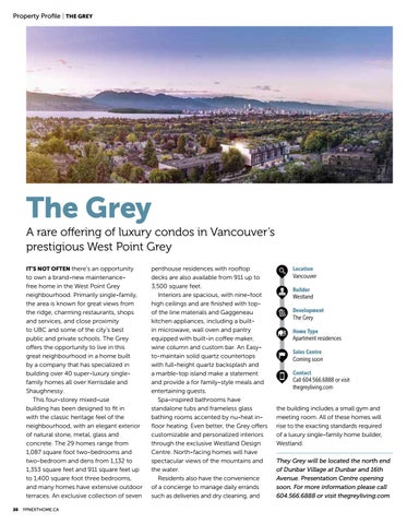 penthouse residences with rooftop decks are also available from 911 up to 3,500 square feet. Interiors are spacious, with nine-foot high ceilings and are finished with topof the line materials and Gaggeneau kitchen appliances, including a builtin microwave, wall oven and pantry equipped with built-in coffee maker, wine column and custom bar. An Easyto-maintain solid quartz countertops with full-height quartz backsplash and a marble-top island make a statement and provide a for family-style meals and entertaining guests. Spa-inspired bathrooms have standalone tubs and frameless glass bathing rooms accented by nu-heat infloor heating. Even better, the Grey offers customizable and personalized interiors through the exclusive Westland Design Centre. North-facing homes will have spectacular views of the mountains and the water. Residents also have the convenience of a concierge to manage daily errands such as deliveries and dry cleaning, and