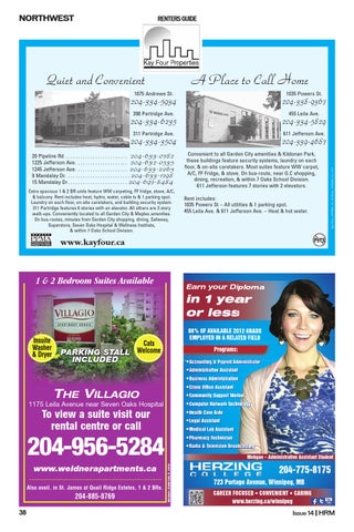 204-338-9367 455 Leila Ave. 204-334-5829 611 Jefferson Ave. 204-339-4687 Convenient to all Garden City amenities & Kildonan Park, these buildings feature security systems, laundry on each floor, & on-site caretakers. Most suites feature WW carpet, A/C, FF Fridge, & stove. On bus-route, near G.C shopping, dining, recreation, & within 7 Oaks School Division. 611 Jefferson features 7 stories with 2 elevators. Rent includes: 1035 Powers St – All utilities & 1 parking spot. 455 Leila Ave. & 611 Jefferson Ave. – Heat & hot water.