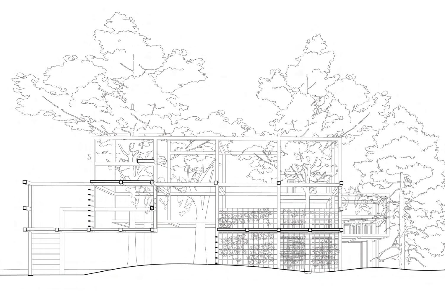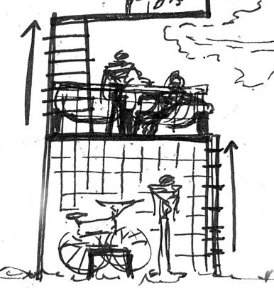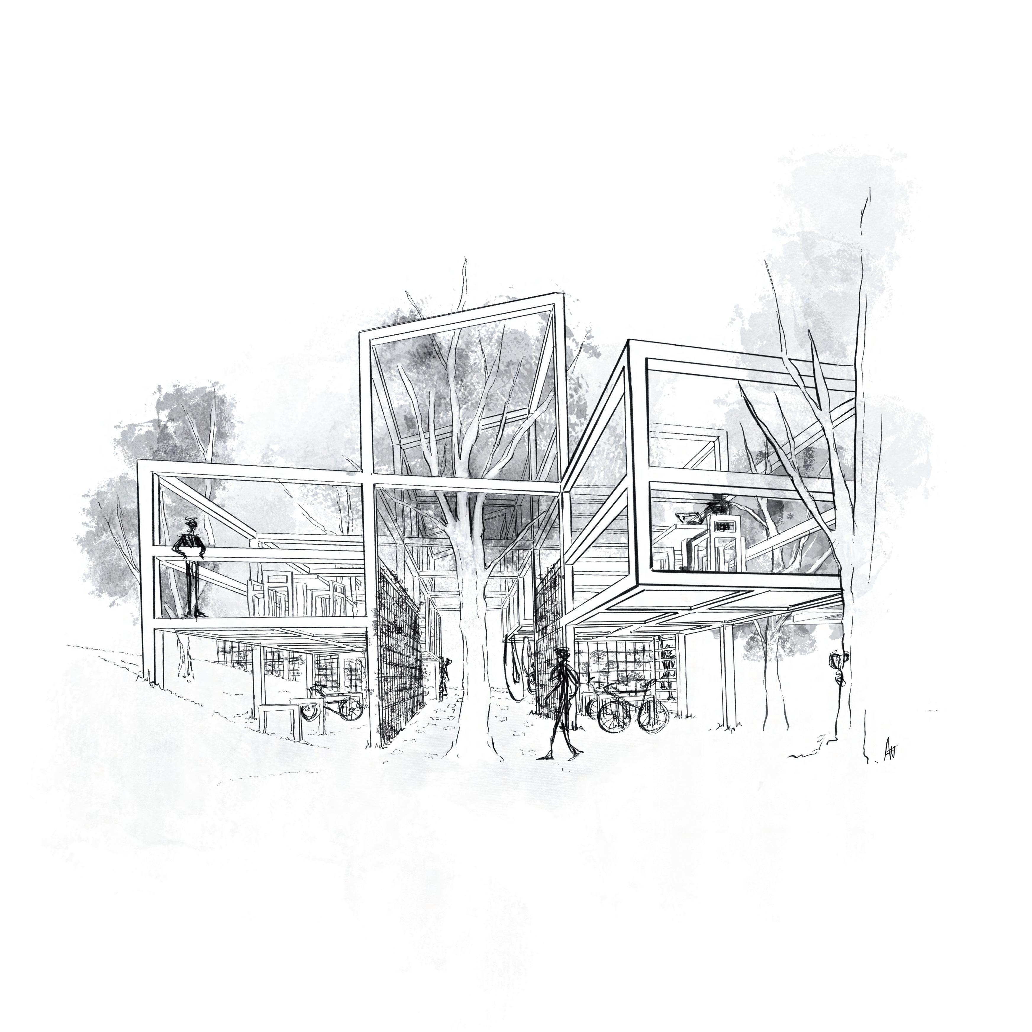 CONCEPT | The design features a layered spatial approach, incorporating bike circulation at the ground level with integrated greenery for privacy and shade. Above, tiered platforms provide flexible spaces for group collaboration and individual respite, fostering a deeper engagement with the natural surroundings. Trees serve as pathway dividers, creating an organic flow through the space, while climbing plants enhance the sensory experience and contribute to sustainability efforts.