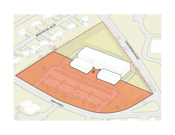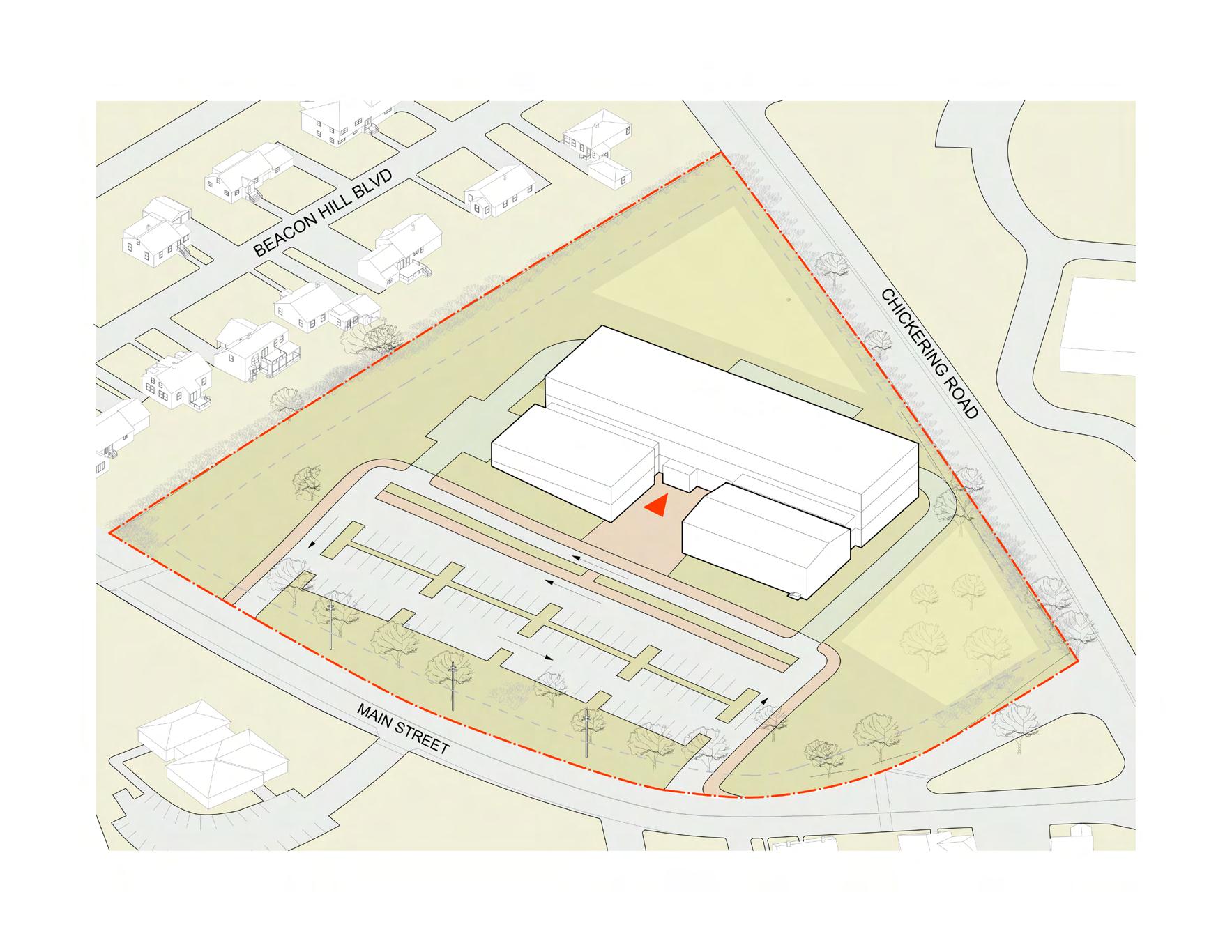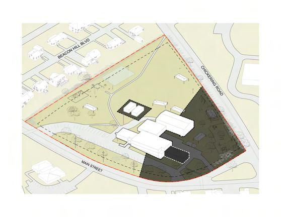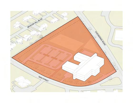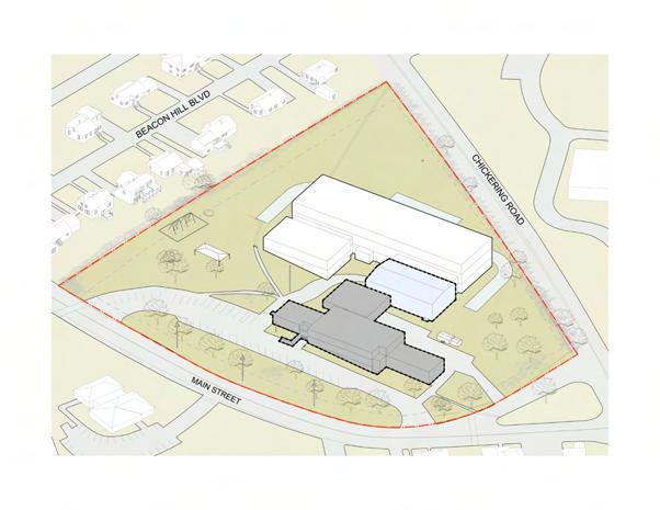 | Machado Silvetti developed phased design strategies to accommodate a growing student body for an MSBA proposal. Two key schemes emerged: one retaining the 1949 main buildings and the newly renovated gym while adding a new school wing, and another preserving only the gym while reorienting the school with new construction on the northern portion of the site.