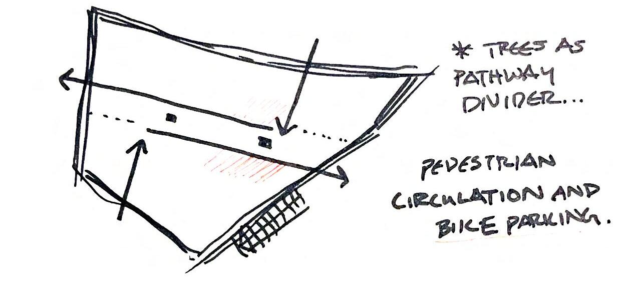 ACCESS | A ten-foot elevation rise at the southern edge of the site enables direct access to the second level of the structure from street level. This design enhances accessibility, offering a seamless entry for those carrying belongings or with limited mobility. Users can engage with the space in a playful, explorative manner or opt for a more practical approach to entering the pavilion, fostering both interaction and inclusivity.