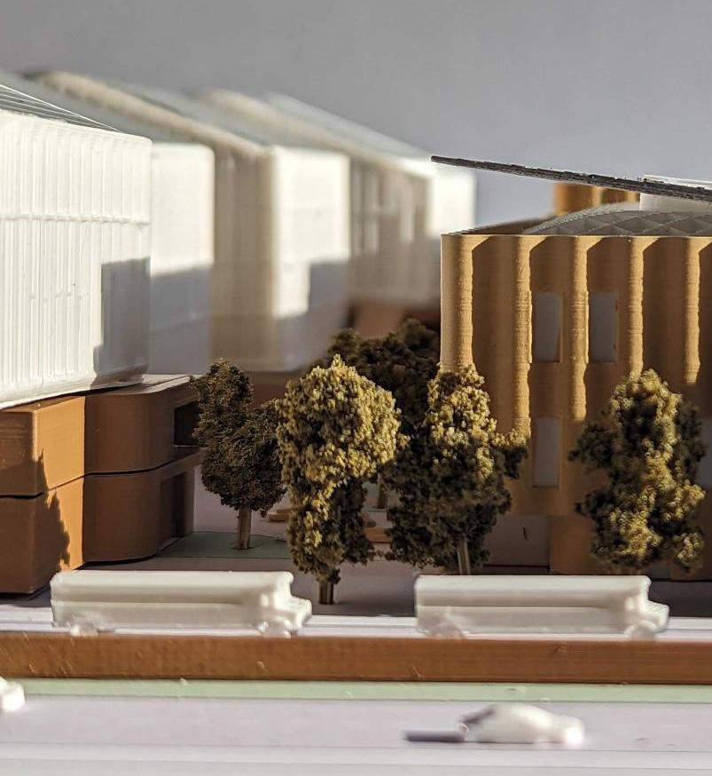 ALSAR-ATELIER | Competition entry. This sunshade structure was designed for a local shopping center in Ann Arbor, Michigan, integrating a metal mesh gradient to create dynamic shading throughout the day. A key aspect of the project was the planting strategy, which prioritized native species resilient to the northern climate. The selected plant palette enhances biodiversity, ensuring year-round vibrancy while requiring minimal maintenance. Model assembled in collaboration with Cyrus Gagaza and Jackson Franks.