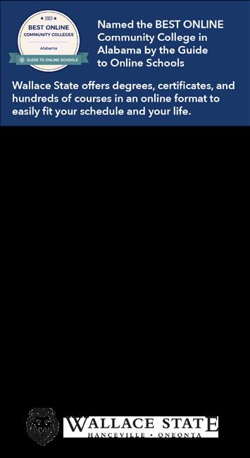 Lions’ Kitchen is a free food pantry open to all Wallace State students. Located in Room 106 of the Student Center. Contact Christine Wiggins, 256.352.8462 or christine. wiggins@wallacestate.edu or Bobby Tarvin at 256.352.8234 or bobby.tarvin@wallacestate.edu. Contact Campus Police after hours at 256.735.9975