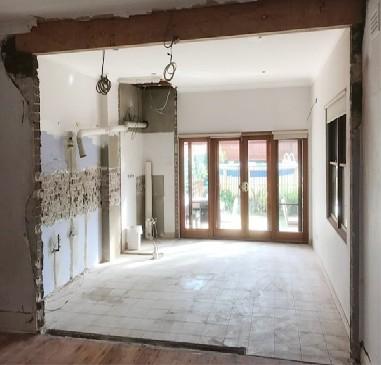 Another load bearing wall removed and replaced with a beam to create a large 8 meter long family kitchen room. The removal of the wall between the kitchen and the lounge room area not only doubles the room size, but it also doubles the amount of Natural / Borrowed light.