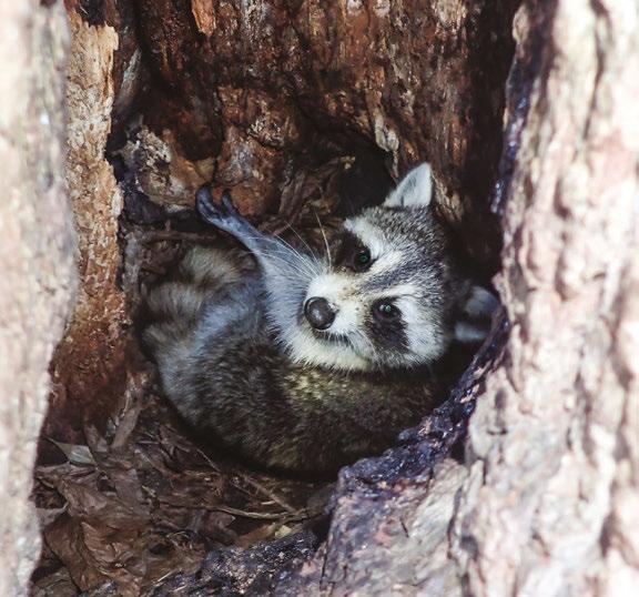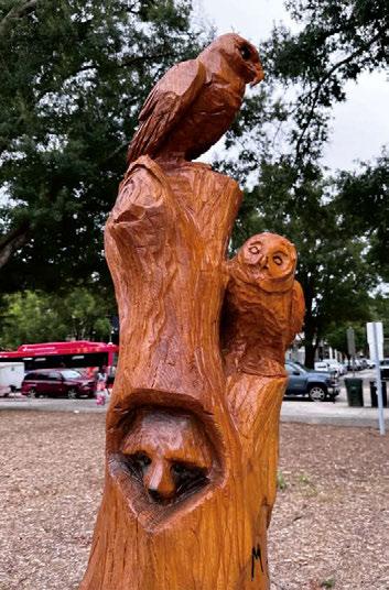 It’s a little thrill to see as you’re walking through Moore Square: a pair of eyes peeking out from a hollow of a tree, a hawk and an owl nearby. They’re close enough to touch but unafraid of visitors — mainly because they’re carved out of wood.