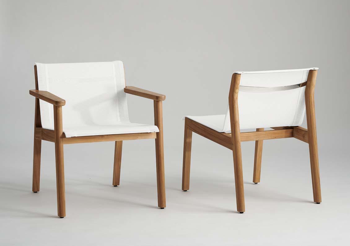This six-piece collection o ers seating options for both dining and lounging. Each piece is crafted with a solid grade-A teak frame, a mesh sling structure, and is topped with upholstered cushions. Quality materials and thoughtful construction promote longevity, while the relaxed posture and clean lines bring an undeniable charm.