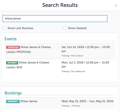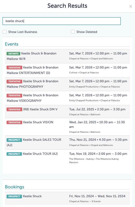 Examples of events include: Tours, Proposals, Rehearsals, Details Meetings and more! Events house all event-specific information, such as timelines, menus, floor plans, and internal notes. Each event record serves as the central workspace for planning and execution, ensuring that sales, operations, and client-facing details stay aligned