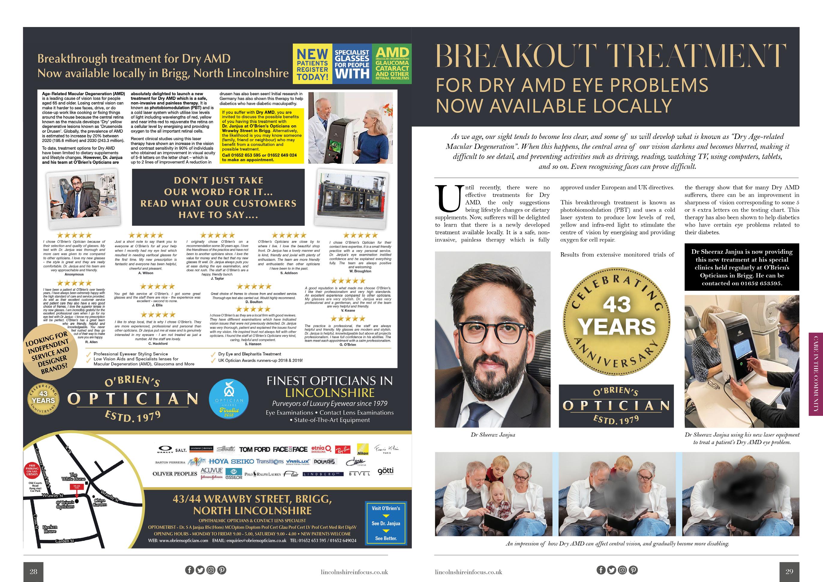 of Luxury Eyewear since 1979 Eye Examinations • Contact Lens Examinations • State-of-The-Art Equipment Visit O’Brien’s See Dr. See Better. A good reputation is what made me choose O’Brien’s. I like their professionalism and very high standards. An excellent experience compared to other opticians. My glasses are very stylish. Dr. Janjua was very professional and a gentleman, and the rest of the team are very helpful and friendly. V. Keane The practice is professional, the staff are always helpful and friendly. My glasses are modern and stylish. Dr. Janjua is helpful, knowledgeable but above all projects professionalism. I have full confidence in his abilities. The team meet each appointment with a calm professionalism. G. O’Brien I chose O’Brien’s Optician for their contact lens expertise. It is a small friendly practice with a very personal service. Dr. Janjua’s eye examination instilled confidence and he explained everything fully. The team are always positive and welcoming. W. Broughton