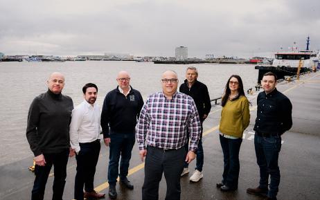 Andrew Oliver, chair of Grimsby Fish Dock Enterprises Ltd (centre), is to become the new chief executive of the group of companies. He is pictured on the quayside at Port of Grimsby East, with directors, from left, David Flear, Ben Walker, Simon Dwyer, Andrew Allard, Maggie Johnson and Danny Payne.