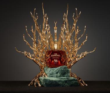 The innovative sculpture design is inspired by the rugged beauty of Speyside, The Glenlivet’s home. A testament to the whisky’s complexity and the dramatic elegance of the Scottish landscape, it powerfully depicts scorched, raw heather branches. The precious single malt is then preserved within a spherical glass decanter, carefully enthroned upon a patinated brass plated base in the form of a cairn. This represents the chimney shaped stacks of rocks originally left before battle by ancient Highland clans as a memorial to fellow warriors and the passing of time. The decanter is finished with a 24k gold plated neck and cap, which is further embellished with a layer of coloured faceted glass in The Glenlivet’s emblematic teal on the bottle closure.