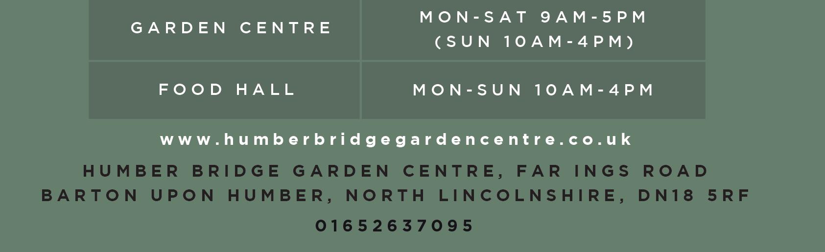 HUMBER BRIDGE GARDEN CENTRE, FAR INGS ROAD, BARTON UPON HUMBER DN18 5RF Call 01652 637095 or visit our website www.humberbridgegardencentre.co.uk