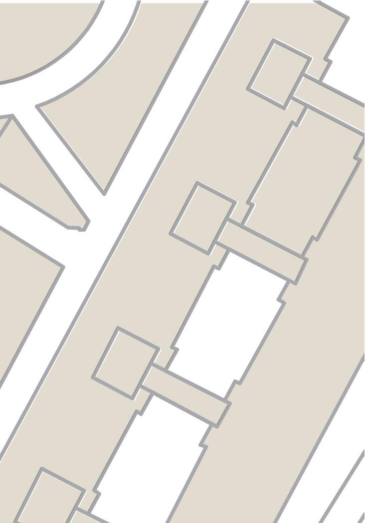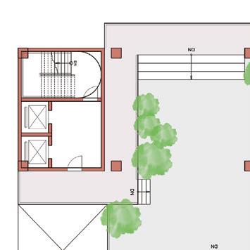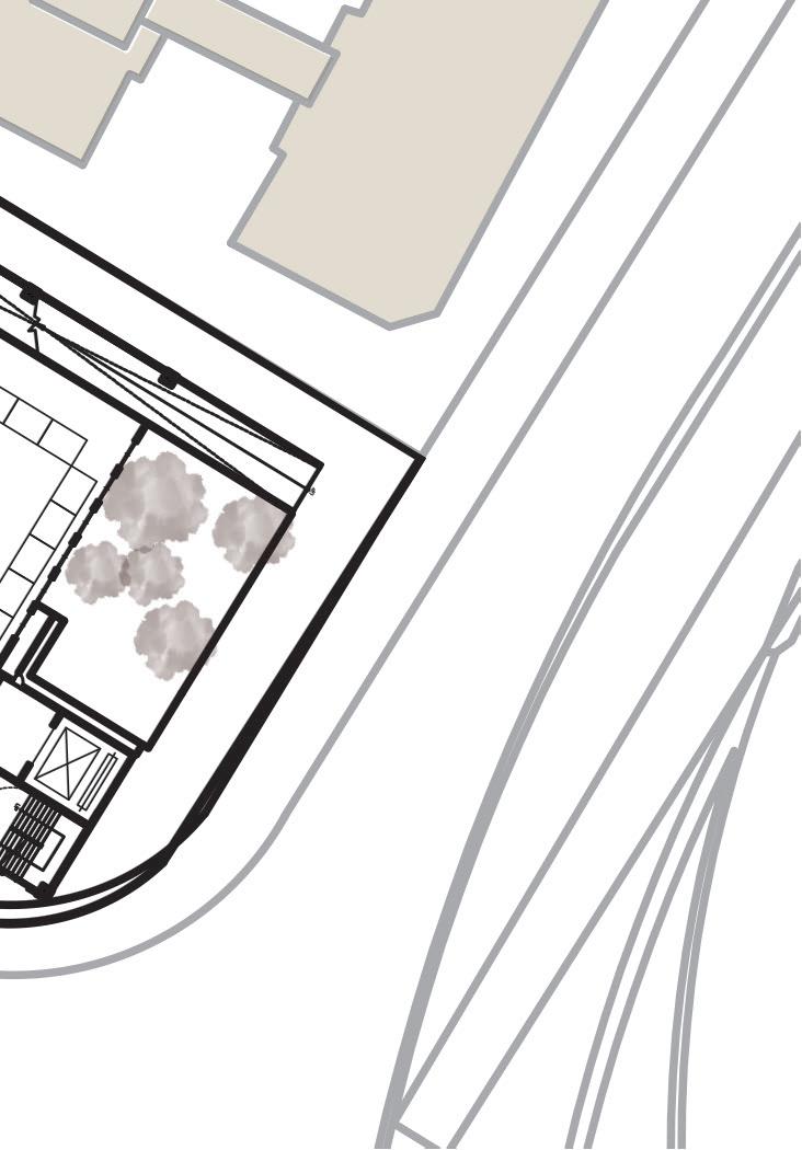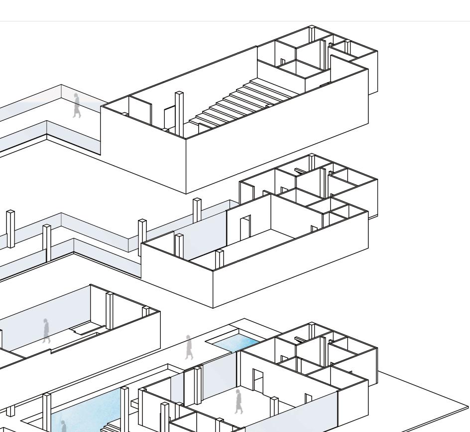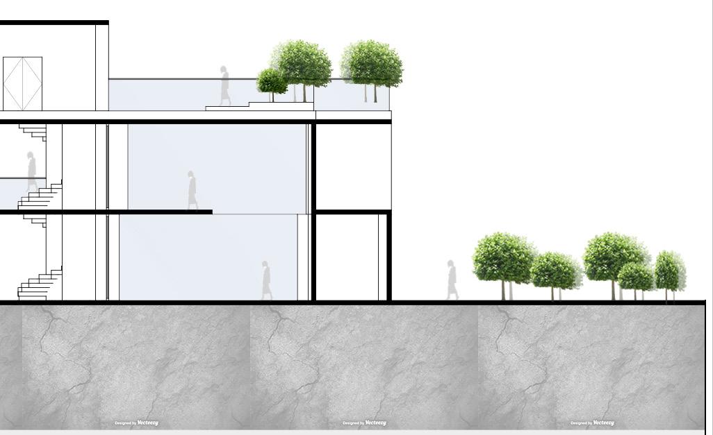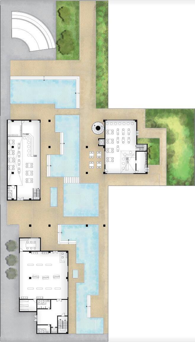 利用綠川延伸藍帶進入基地,貫穿主體建築的分布,利用不一樣的退縮、 樓梯的設置,創造初步一樣大小的休憩角落,提供幼年至老年人都能做 使用。