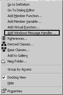 首先在要响应 WM_COPYDATA 消息的窗口对应的类上单击鼠标右键,在弹出的快捷菜单 中选择“Add Windows Message Handler”,如图 1-14 所示。选择该菜单项后会出现如图 1-15 所示的添加消息响应函数对话框。