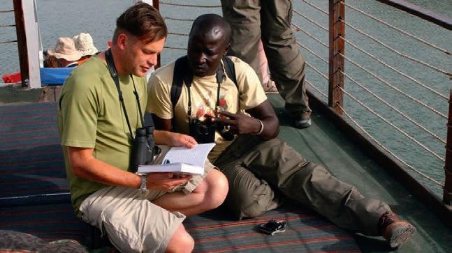 Keeping a lookout (top–bottom) Malick and Chris Packham consult their notes way back in 2011 – the pair have been guiding together for over 25 years; Malick scans for birds in the forests of The Gambia, a country with over 600 recorded bird species