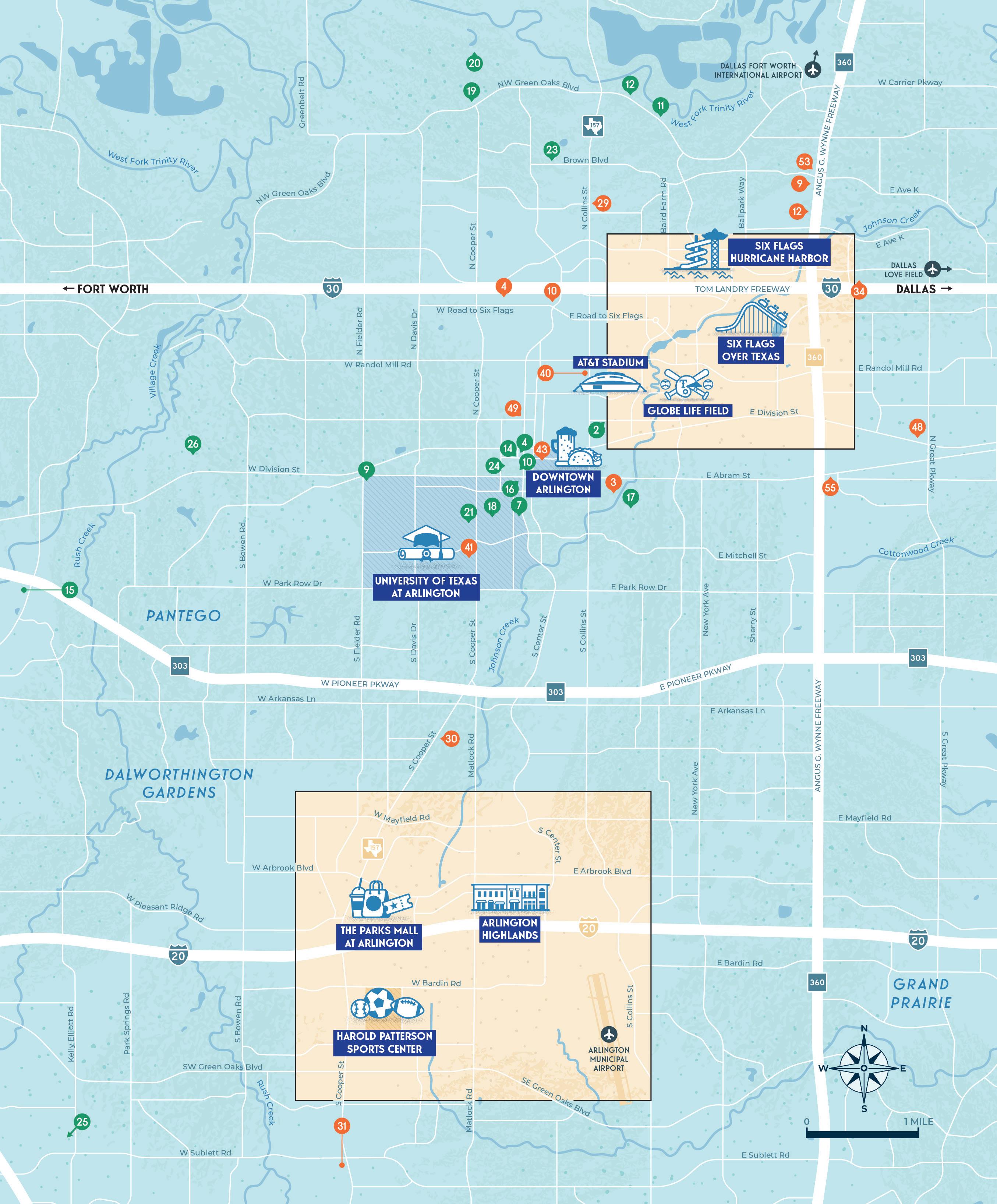 WHETHER YOU ARRIVE by air or land, you’re moments away from exploring all Arlington has to offer. Most travelers fly into Dallas Fort Worth International Airport (DFW), approximately 11 miles from the Entertainment District. Alaska, Delta, and Southwest flyers may also use Dallas Love Field (DAL), about 21 miles away. Meanwhile, Arlington Municipal Airport serves general aviation and private jets—and it’s just four miles south of the city center.