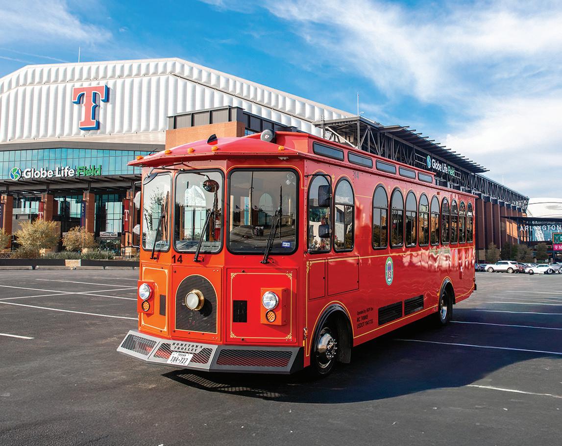 Catch a ride to fun! Arlington Trolley offers complimentary service for guests staying at participating hotels in the Entertainment District to nearby attractions, including Six Flags Over Texas and Hurricane Harbor, Globe Life Field, and AT&T Stadium. In service since 1996. Find routes and schedules at arlingtontrolley.com.
