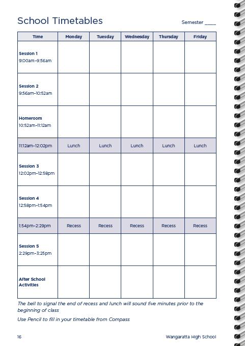 To complement our Homeroom system and support student Readiness to Learn we issue all students with a Wangaratta High School Diary. This will occur on the first day of school. The Diary is to be bought to each class and signed weekly by the parent/carer and Homeroom teacher It is primarily designed to facilitate personal and learning organisation