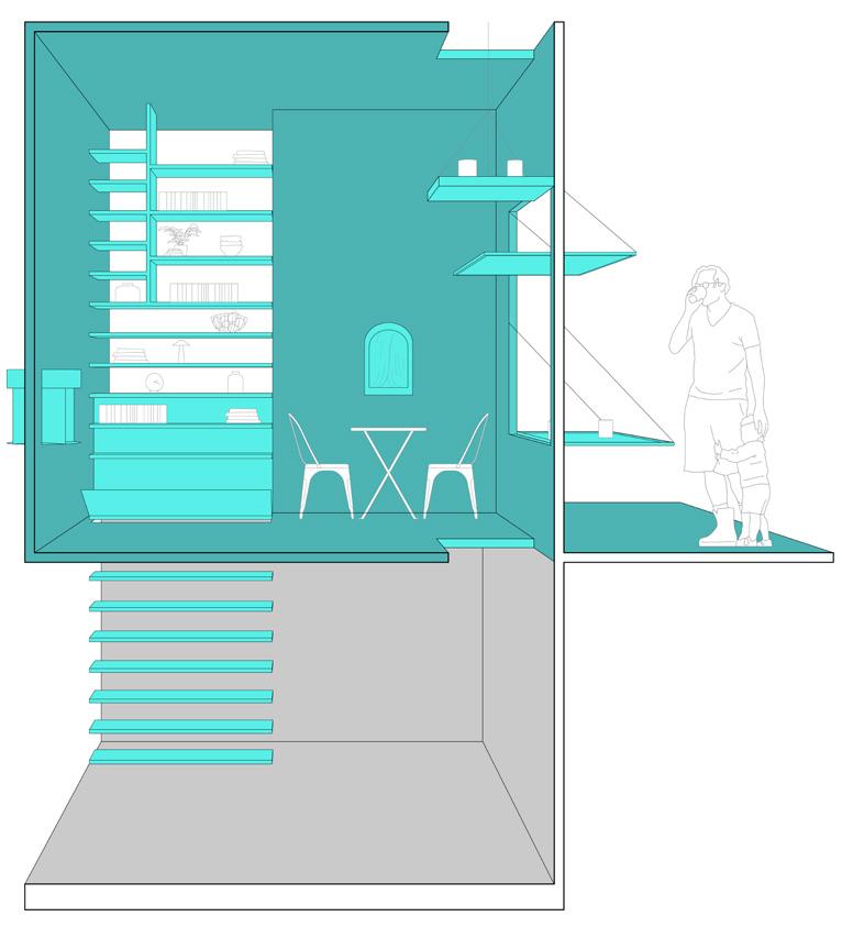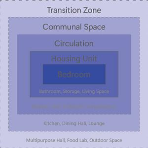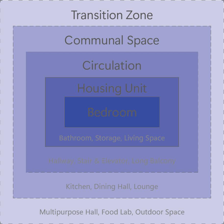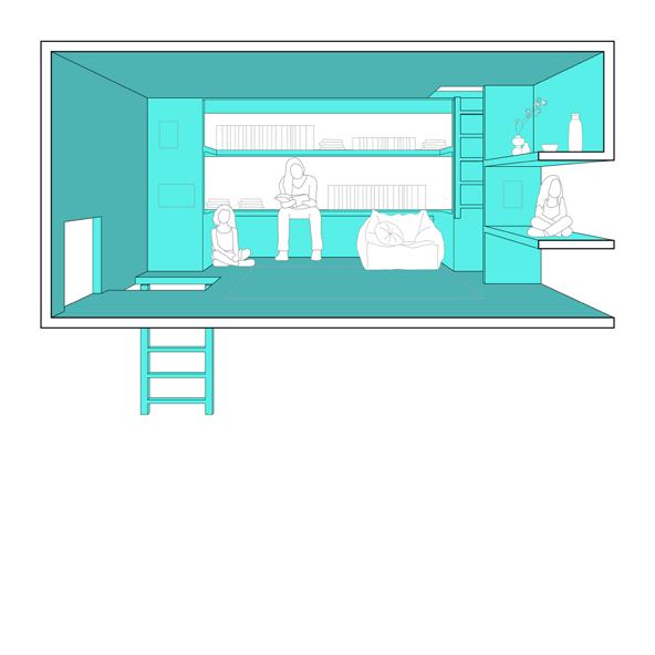 Minimize private space to force residents to shared spaces, boosting social interactions and forming a community. Interaction spaces attract local people and have interactions with the residents, helping them to fit in the new environment.