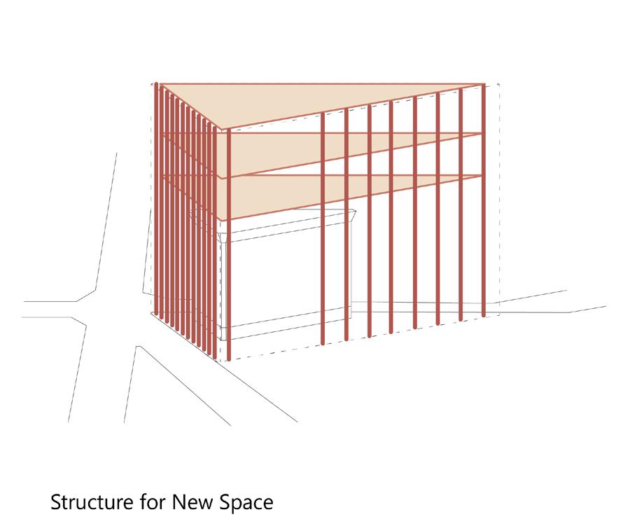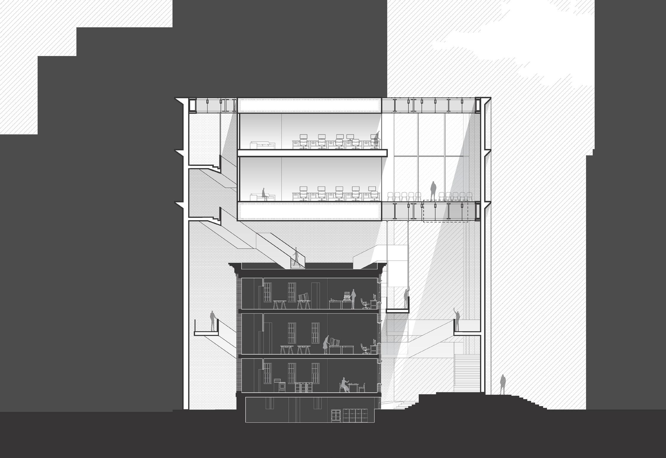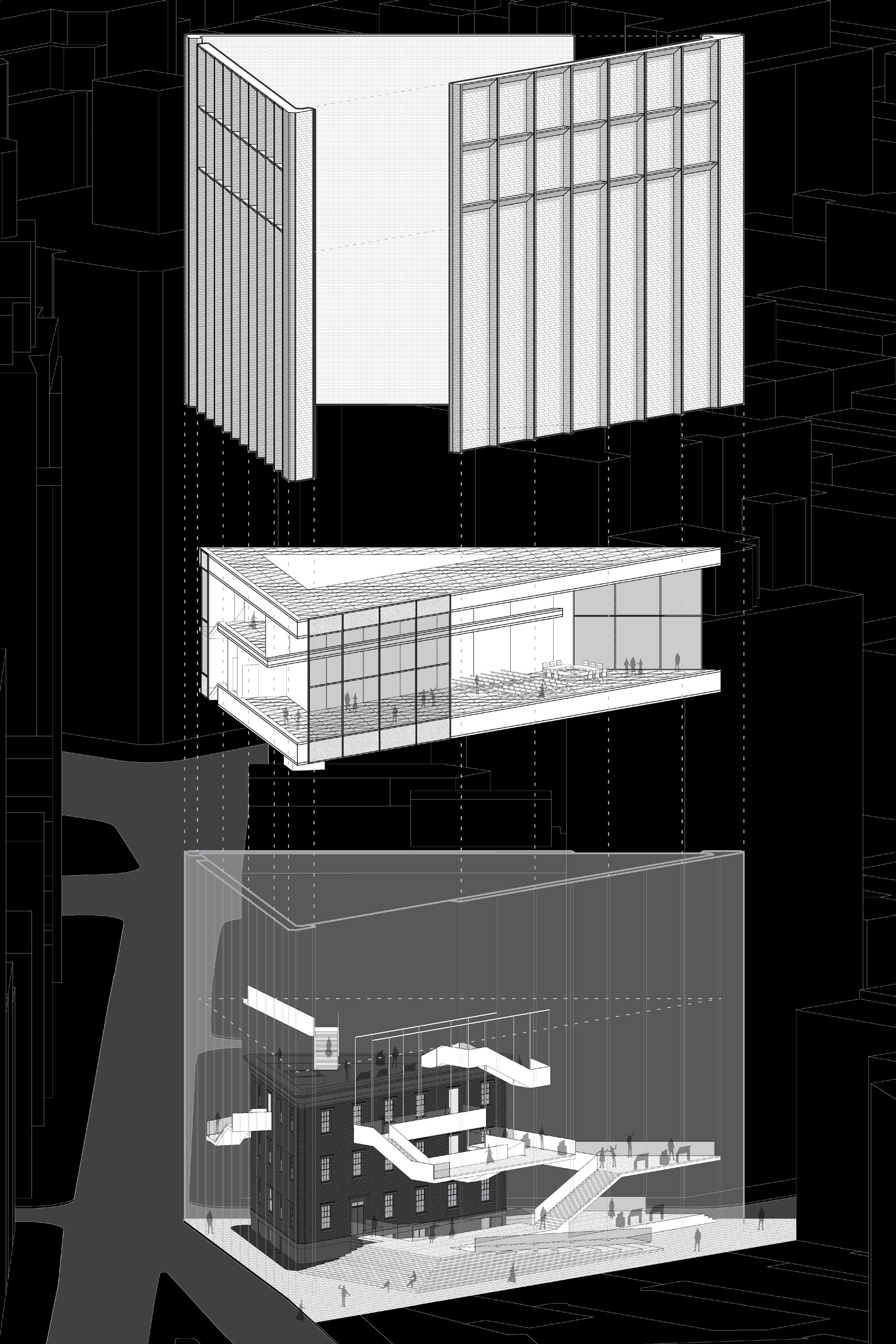 While preserving the original building, the proposal creates new opportunities for engagements with minimally invasive intervention avoiding reduction to the existing façade except for a few key needed interactions, turning the historic building into a living exhibit.
