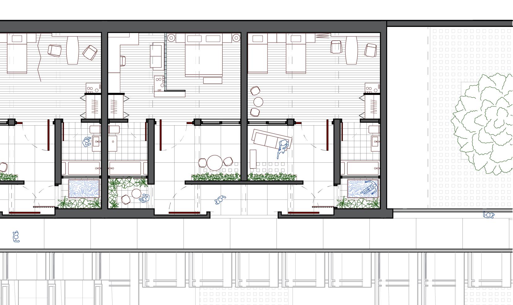 Flexible housing units can be modified according to the needs of the residents. Every unit gets its own bathroom and storage. The extruded columns leave the structural possibility of future expansion.