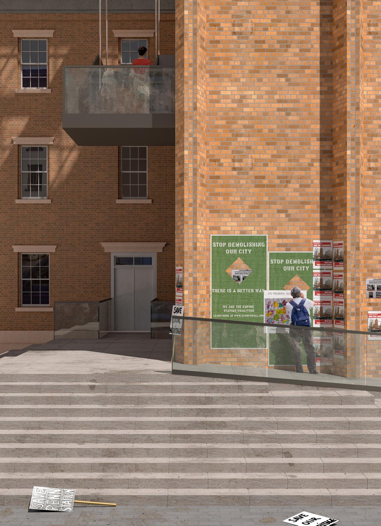 This design seeks to bring a more monumental and civic architecture that frames the craftsmanship of local buildings and LPC’s core policy of historical façade preservation.