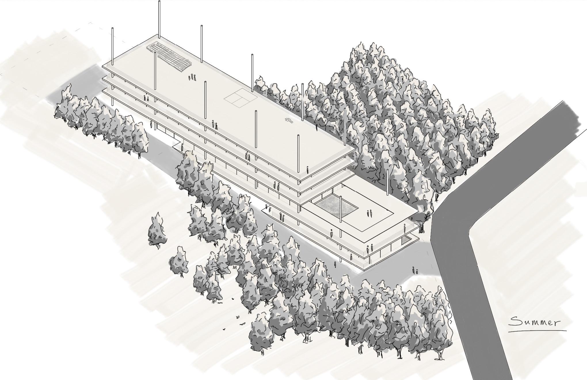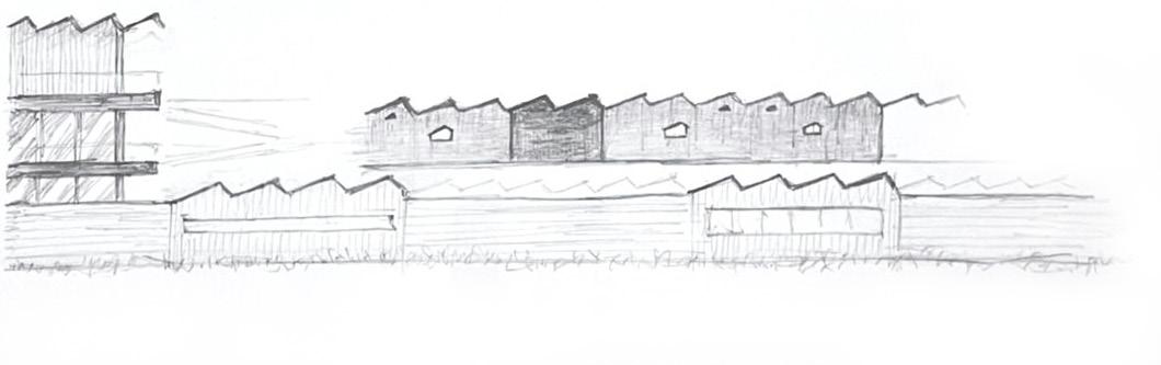 At a narrow and long site on the slope of a railway trench, this proposal pays its tribute to the railway system once extensive and now still an important infrastructure for the site neighborhood, with the roofs inspired by crossties and linear-distributed spaces.