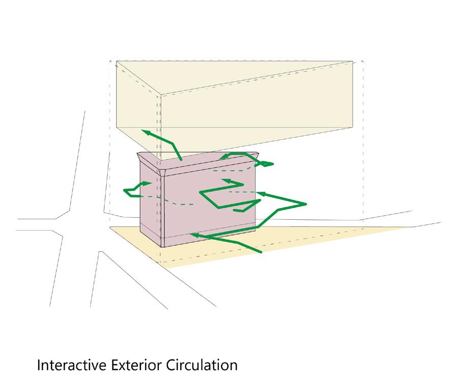 Engagement: Surrounds the original building with circulations, creating experiences of viewing the original building from previously impossible perspectives.