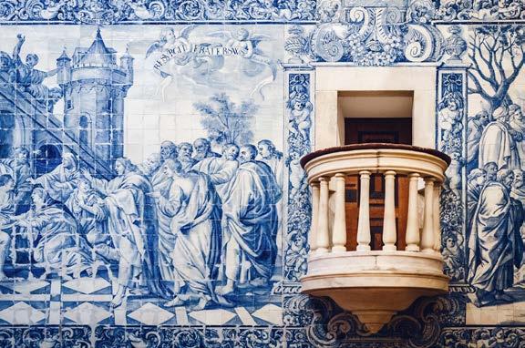 This page clockwise: From the local winery; the pulpit of the baroque Igreja da Misericórdia with its masterpiece of azulejos painted tiles; homes buit into the aquaduct.