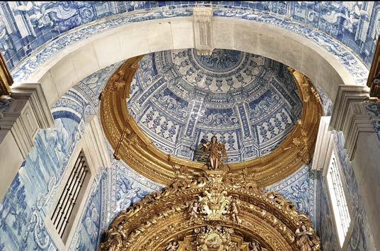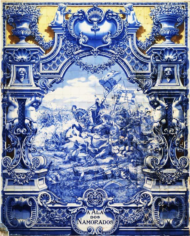 Jesus, University of Coimbra; The church of São Lourenço in Almancil; intricately-detailed Portuguese tiles. Opposite page: Panel by Jorge Colaço (1922) in Lisbon’s Pavilhão Carlos Lopes, representing the 1385 battle of Aljubarrota between the Portuguese and Castillian armies