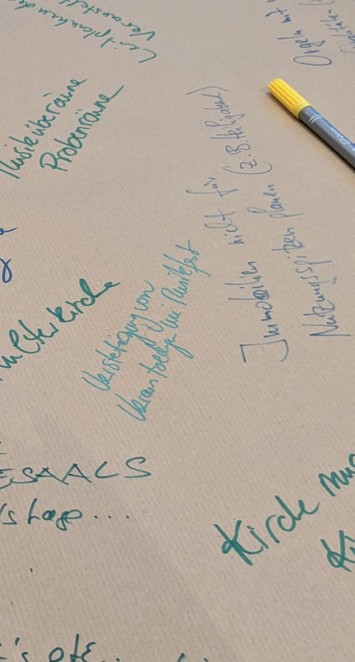 turen & Konzepte und Gemeinschaft sein & Gemeinschaft schaffen in Gruppen) interessierte uns besonders, welche Wünsche und Bedürfnisse es innerhalb der Wannseer Gemeinschaft gibt? Und wo Gemeinde in Zukunft gefragt sein wird? Ohne der Gemeinde ihre Traditionen absprechen zu wollen, lautete ein Wunsch: Mehr Offenheit gegenüber