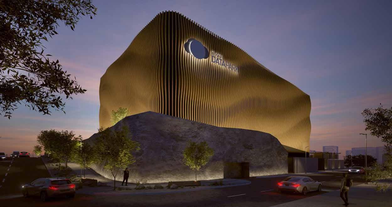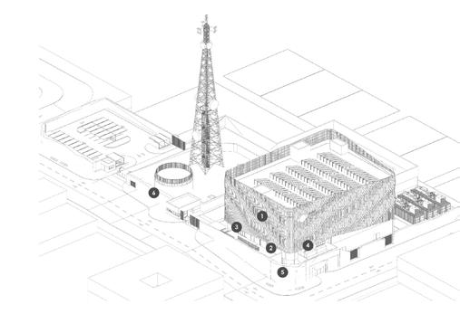 The overall massing of the data centre is distinctly defined into one mass sits in the corner of the site. The massing has 4 main elements which are: