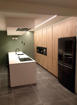Wara verzorgde de hele verbouwing tot en met de verlichting toe. Het resultaat mag er zijn: een strakke moderne keuken met een warm houtaccent en inbouwapparaten met met de laatste nieuwigheden.