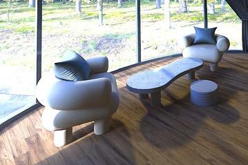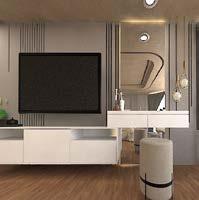 The living area showcases statement furniture with curved silhouettes, while the media unit adds a sleek, minimalist touch.