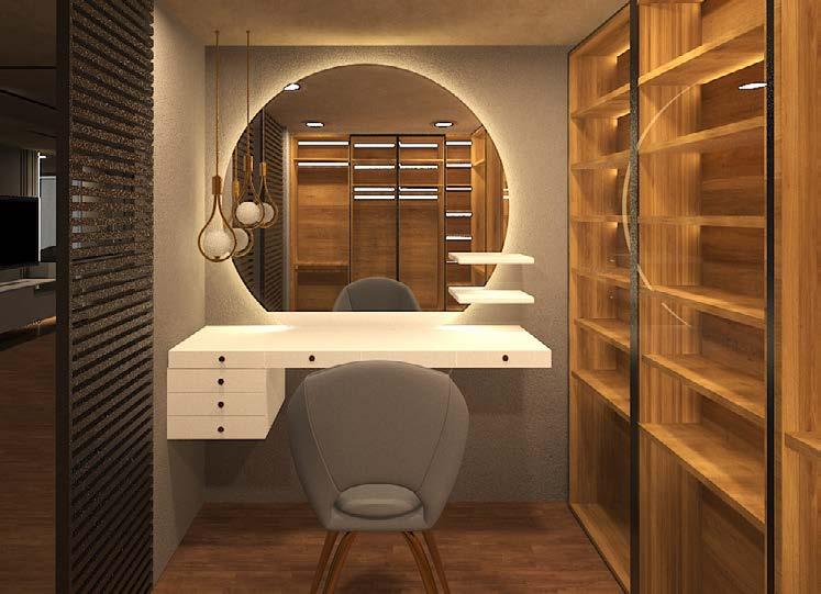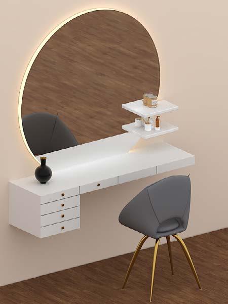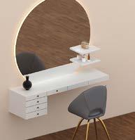 This modern vanity setup embodies a seamless fusion of elegance and functionality. The floating white vanity features a clean, minimalist design with multiple drawers for storage, ensuring an organized and clutter-free space. A striking circular mirror with integrated LED backlighting enhances both aesthetics and practicality, providing soft, ambient illumination. Complementing the vanity is a sleek, ergonomic chair with a curved, upholstered seat in a sophisticated gray tone, supported by gold-finished legs that add a touch of luxury. Floating shelves positioned to the side offer additional storage for beauty essentials, maximizing efficiency without compromising style. This refined arrangement showcases contemporary interior design at its finest, where simplicity meets sophistication in a thoughtfully curated space.