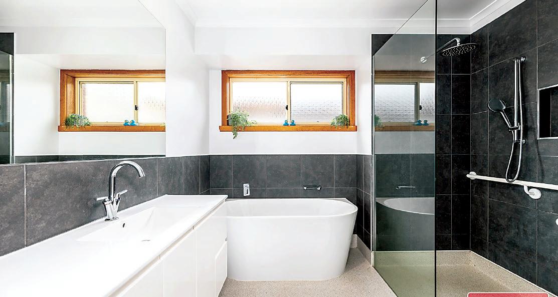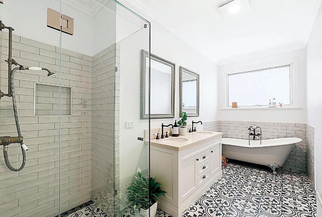 colour theme of grey and white with quality tiling, fixtures and chrome tapware. The ensuite has twin basins, oversized shower and a toilet, whereas the bathroom includes a luxurious deep bath.