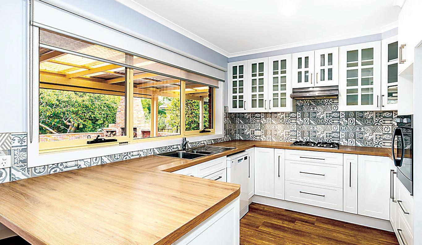Laminate benchtops with a wood grain finish are featured in the kitchen, complemented by white profile cabinetry, glass overhead display units and a decorative tiled splashback.