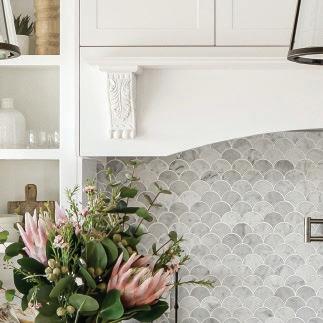 Showpiece of the home is the kitchen, elegant and functional with Caesarstone work surfaces, white country profile cabinetry and a hex tiled splashback.