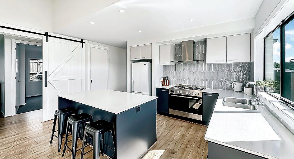 Well equipped for the home chef, the kitchen features stone countertops, smart dark grey cabinetry, white overheads and decorative splash tiles teamed with a 900mm cooker, canopy rangehood, dishwasher and a walkin pantry.