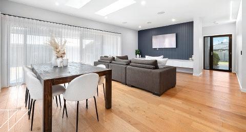 Travertine pavers line the front porch, a bespoke frosted glass front door opens to the living area where premium oak laminate flooring enhances the relaxed style.