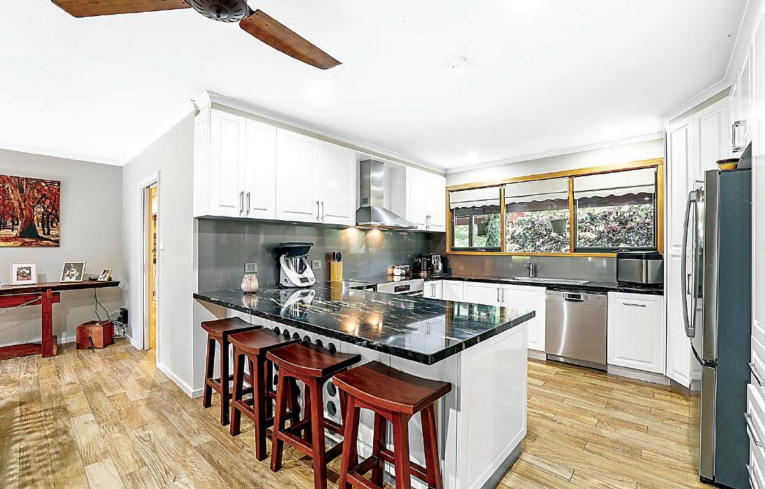Timeless black and white is the theme for the kitchen with stunning stone countertops and quality appliances including an all electric Westinghouse 900mm cooker, canopy rangehood, Bosch dishwasher, fixtures for a plumbed fridge and a breakfast bar with inbuilt wine rack.